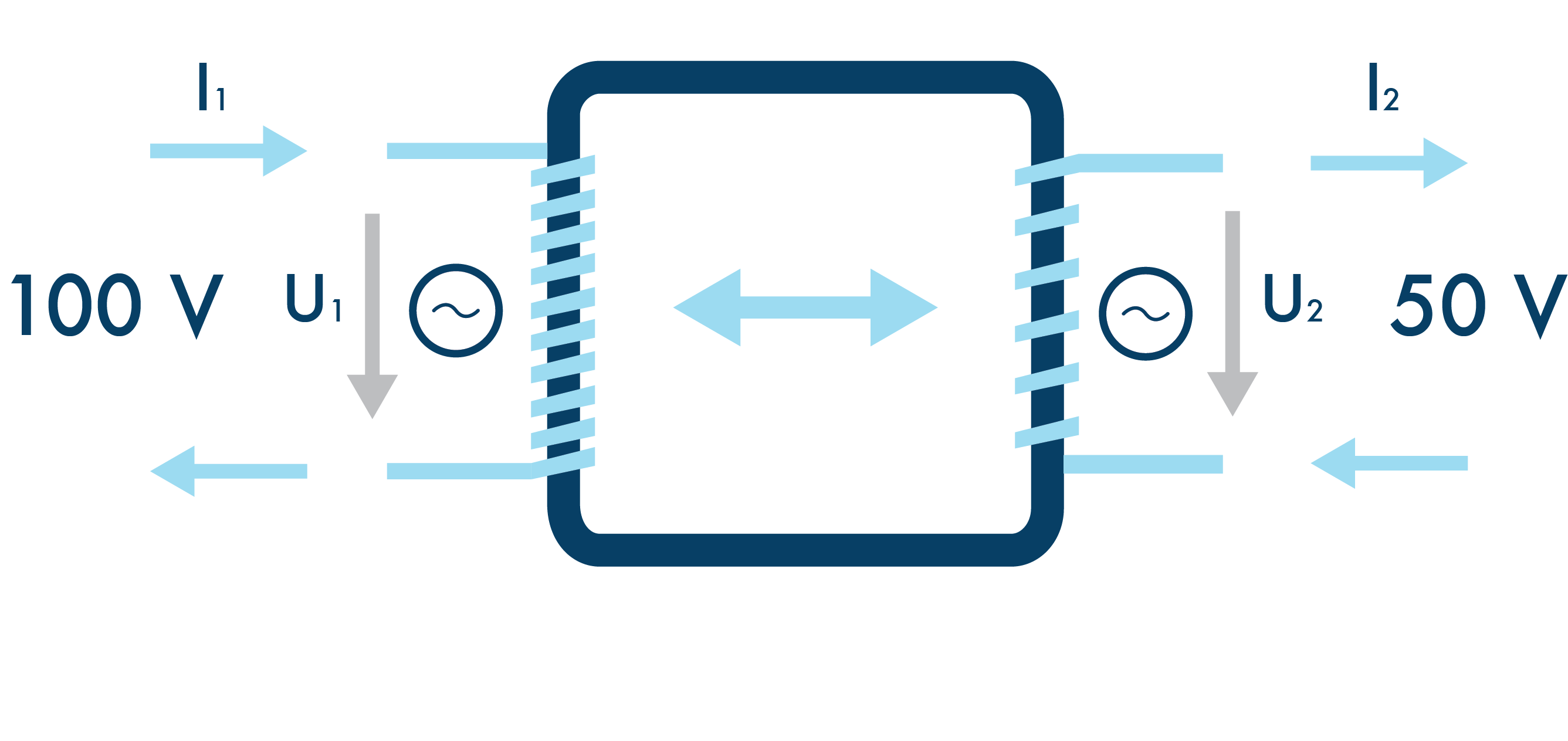 Ein Transformator wandelt die Höhe einer eingehenden Wechselspannung um. Die Spannung wird an den Bedarf des Verbrauchers angepasst.